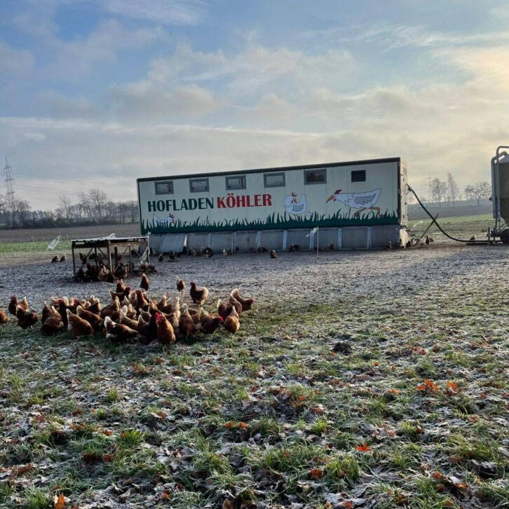 In unseren zwei Mobilställen leben unsere Leghennen in Freilandhaltung. Morgens um 10 Uhr werden sie auf die Hühnerwiese gelassen und haben tagsüber viel Auslauf und Bewegung.